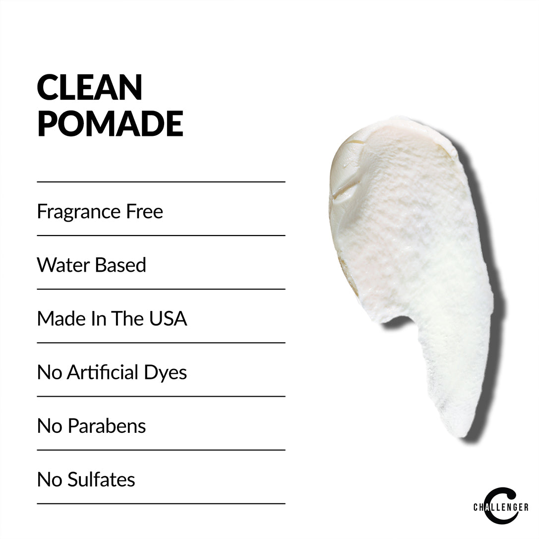 Challenger Clean combines the best of Challenger hair product hold with cutting edge formulation to bring the best product that combines both reliable hold with a non-comedogenic hair styling product that’s also fragrance free. For all you particular folks out there! We made Clean for those with sensitive skin, acne, athletes who sweat, and anyone who may appreciate that clean life. With a matte finish, reliable hold, scent free, water based and water soluble formula, you’ll be happy with Challenger Clean